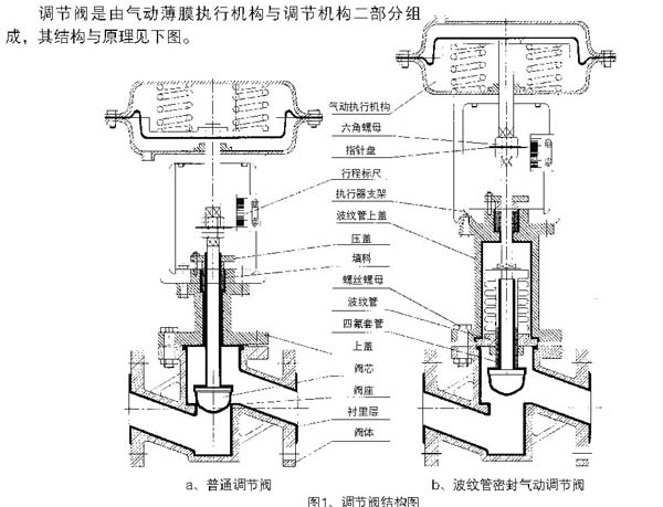執(zhí)行機(jī)構(gòu)是氣動(dòng)調(diào)節(jié)閥生產(chǎn)過(guò)程自動(dòng)控制系統(tǒng)的重要組成部分,其有正反兩種作用形式,當(dāng)信號(hào)壓力增加,推桿伸出膜室的叫正作用,與閥配合構(gòu)成氣關(guān)式【如圖2a】。當(dāng)信號(hào)壓力增加,推桿退出膜室的叫反作用,與閥配合構(gòu)成氣開(kāi)式【如2b】。其原理:當(dāng)信號(hào)壓力輸人膜室后,在膜片上產(chǎn)生推力,壓縮彈簧,使推桿移動(dòng),帶動(dòng)閥桿,改變閥芯與閥座之間的流通面積,直到彈簧的反作用與信號(hào)壓力作用在膜片上的推力相平衡,從而達(dá)到自動(dòng)調(diào)節(jié)工藝參數(shù)之目的。